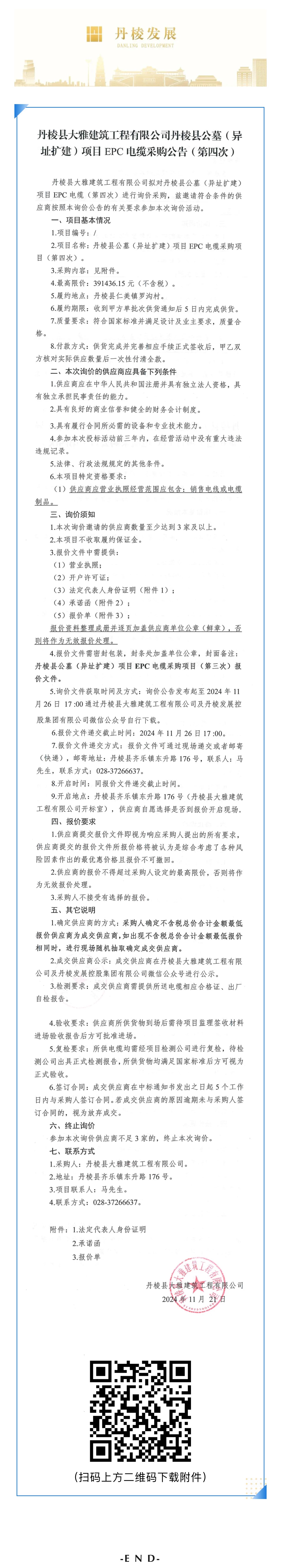 丹棱縣大雅建筑工程有限公司丹棱縣公墓(異址擴(kuò)建)項目EPC電纜采購公告(第四次)