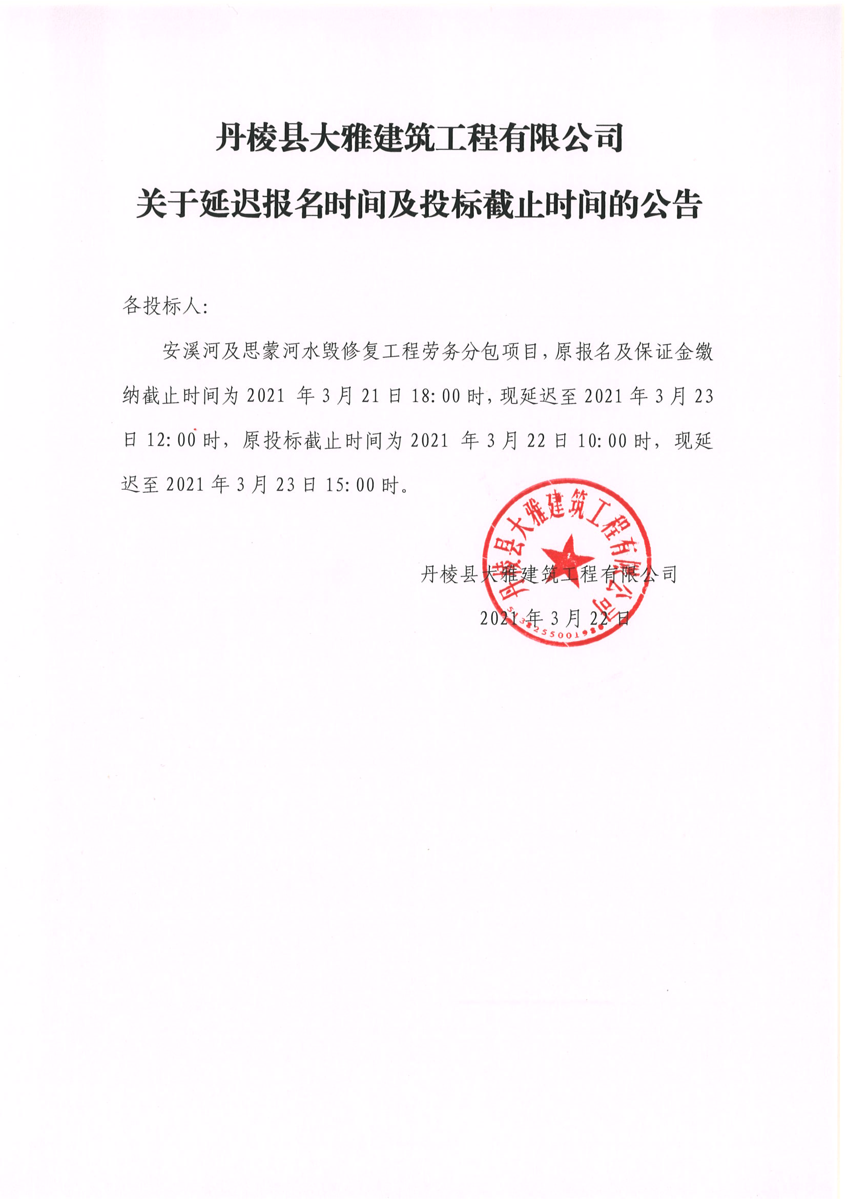 【大雅建筑公司】關于安溪河及思蒙河水毀修復工程勞務分包項目延遲報名時間及投標截止時間的公告