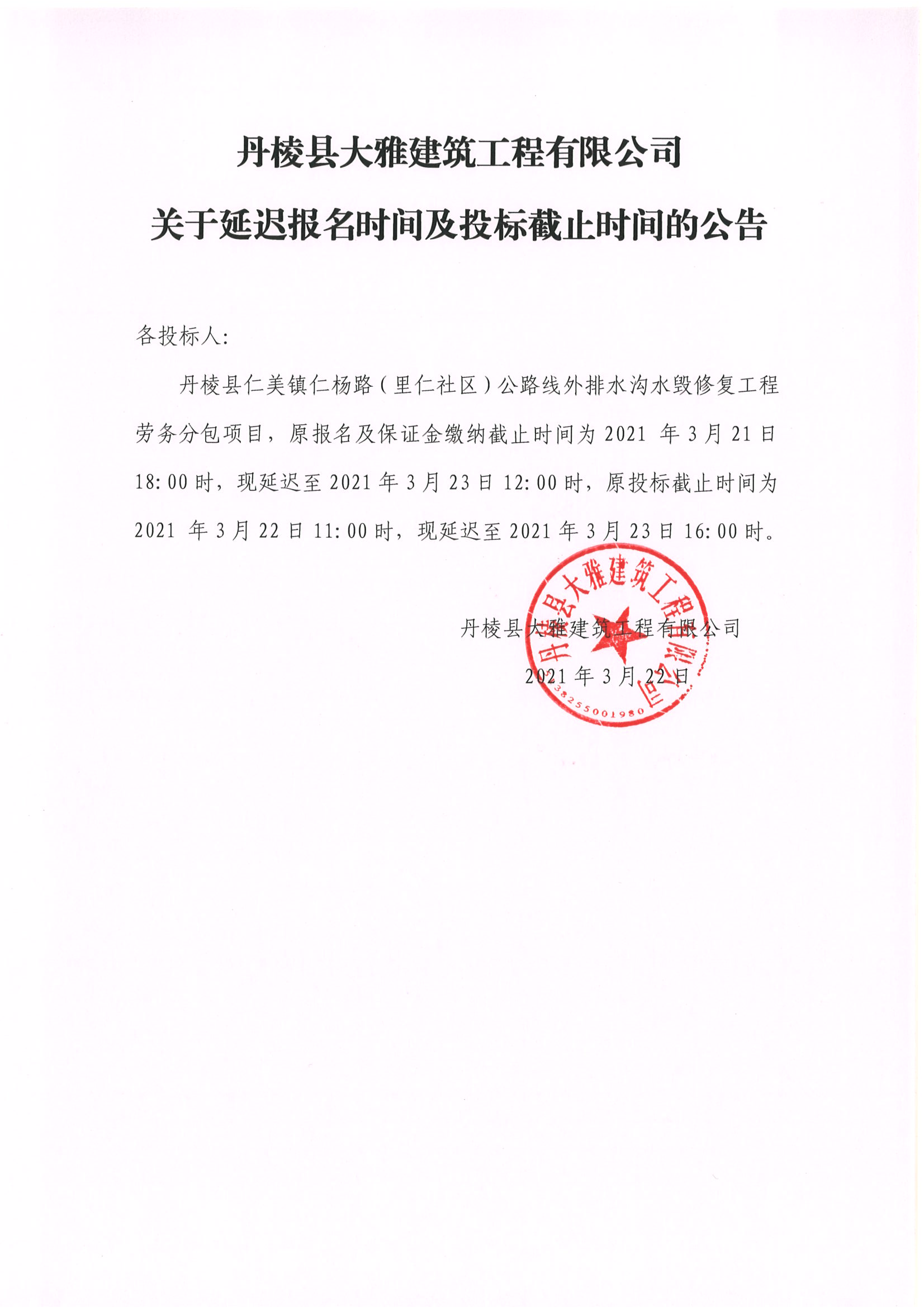 【大雅建筑公司】丹棱縣仁美鎮(zhèn)仁楊路(里仁社區(qū))公路線外排水溝水毀修復工程勞務分包關于延遲報名時間及投標截止時間的公告