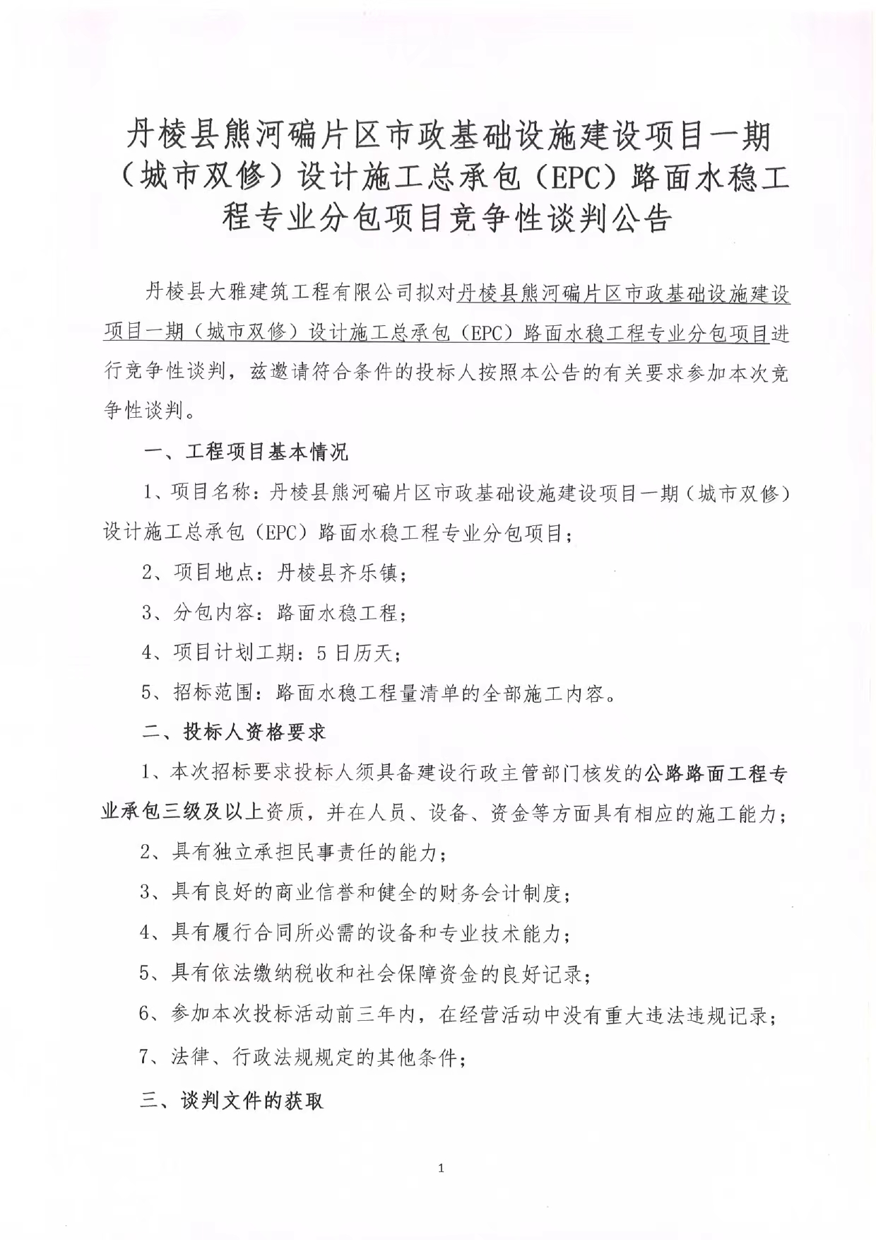 丹棱縣熊河碥片區(qū)市政基礎(chǔ)設(shè)施建設(shè)項(xiàng)目一期(城市雙修)設(shè)計(jì)施工總承包(EPC)路面水穩(wěn)工 程專業(yè)分包項(xiàng)目競(jìng)爭(zhēng)性談判公告
