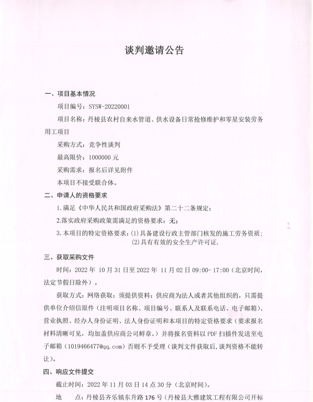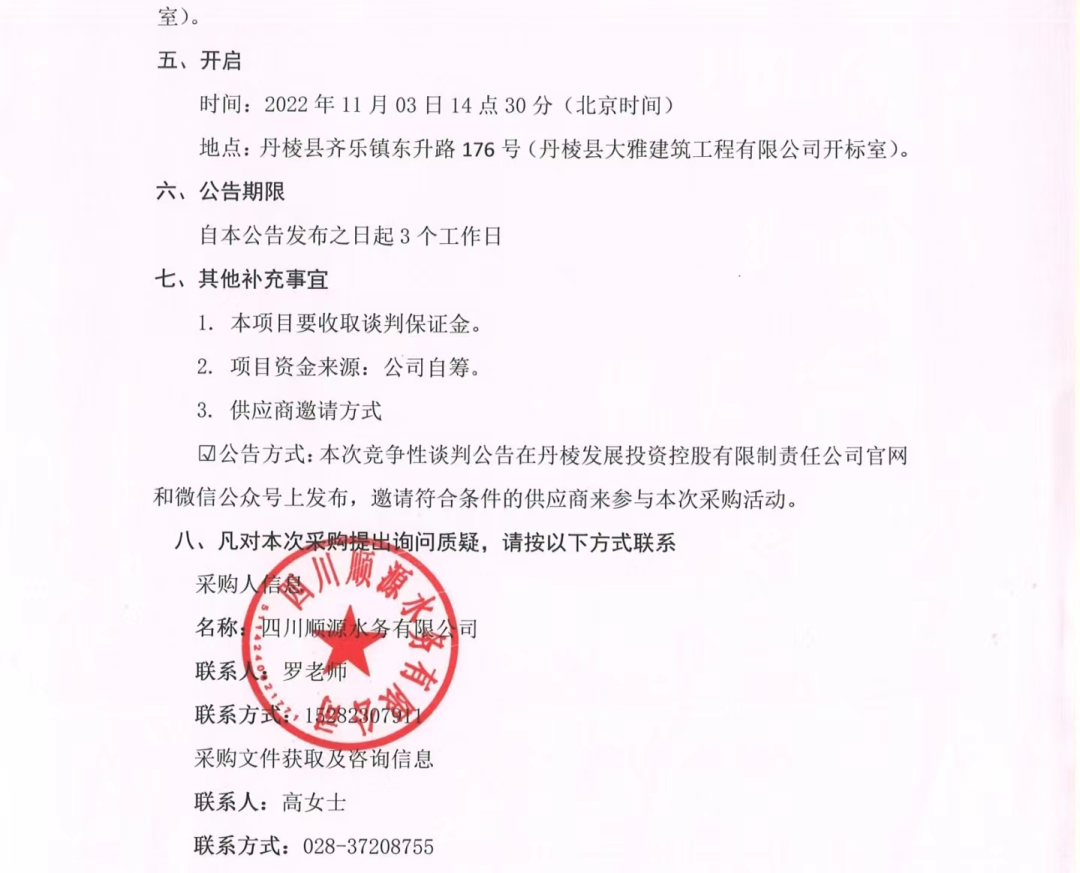 丹棱縣農(nóng)村自來水管道、供水設(shè)備日常搶修維護(hù)和零星安裝勞務(wù)用工項(xiàng)目談判邀請(qǐng)公告
