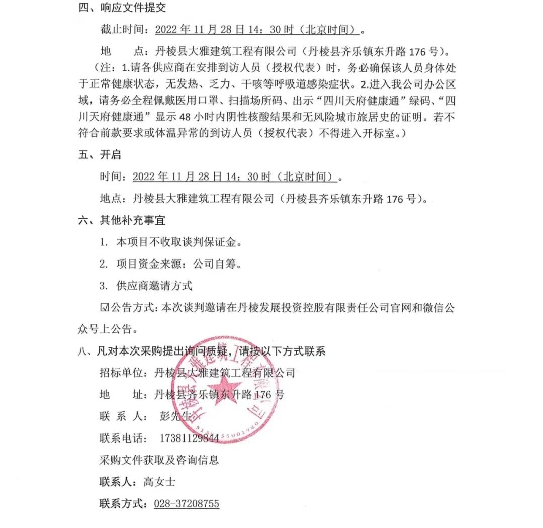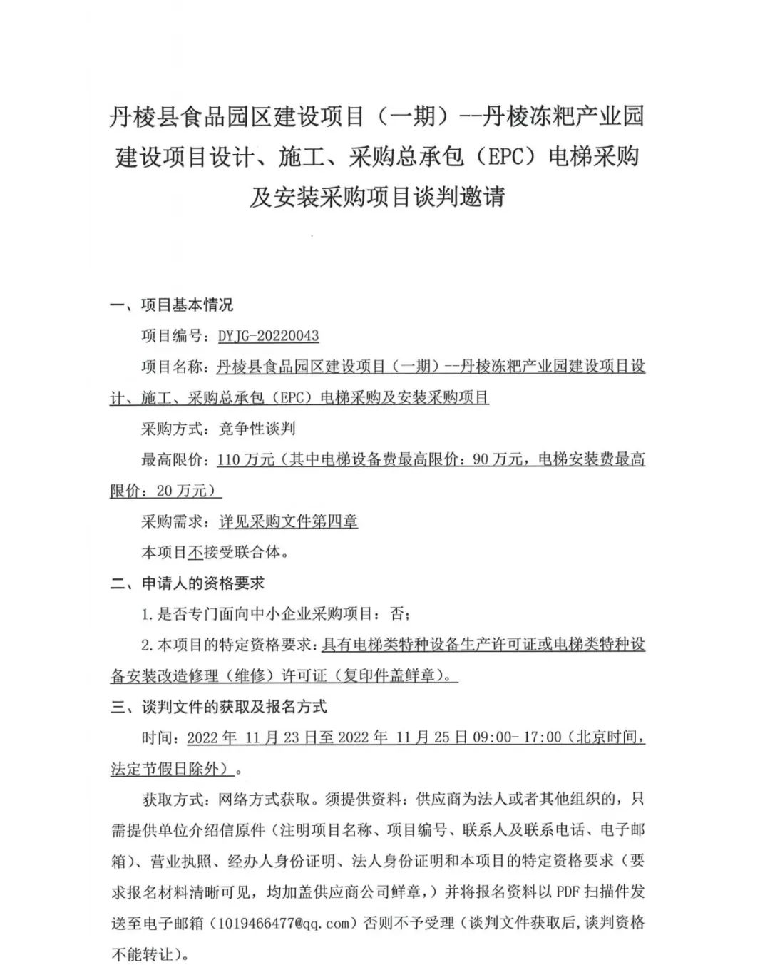 丹棱縣食品園區(qū)建設(shè)項(xiàng)目 (一期)--丹棱凍粑產(chǎn)業(yè)園建設(shè)項(xiàng)目設(shè)計、施工、采購總承包 (EPC) 電梯采購及安裝采購項(xiàng)目談判邀請公告