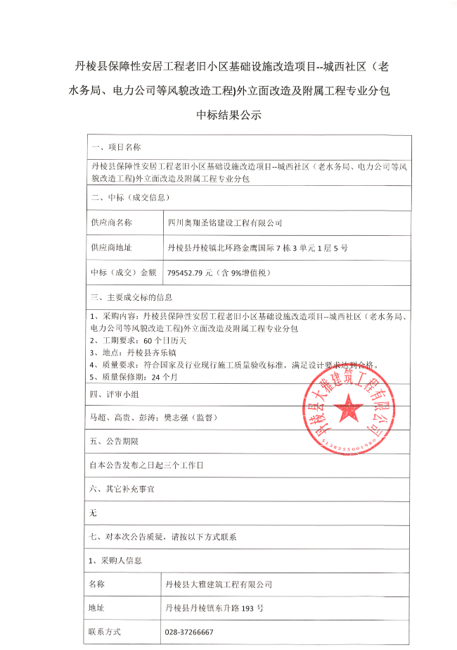 【大雅建筑公司】丹棱縣保障性安居工程老舊小區(qū)基礎(chǔ)設(shè)施改造項目--城西社區(qū)(老水務(wù)局、電力公司等風(fēng)貌改造工程)外立面改造及附屬工程專業(yè)分包中標結(jié)果公示
