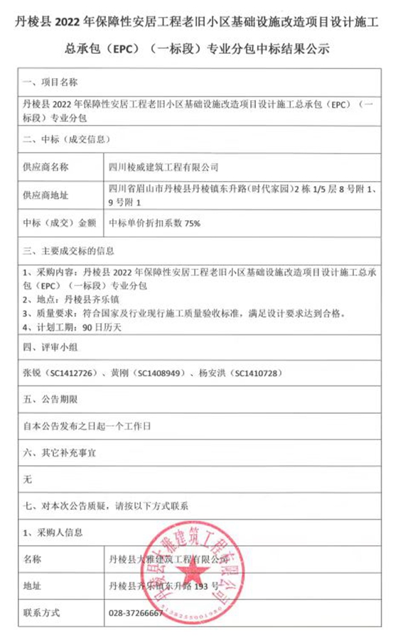 丹棱縣2022年保障性安居工程老舊小區(qū)基礎設施改造項目設計施工總承包(EPC)(一標段)專業(yè)分包中標結(jié)果公示