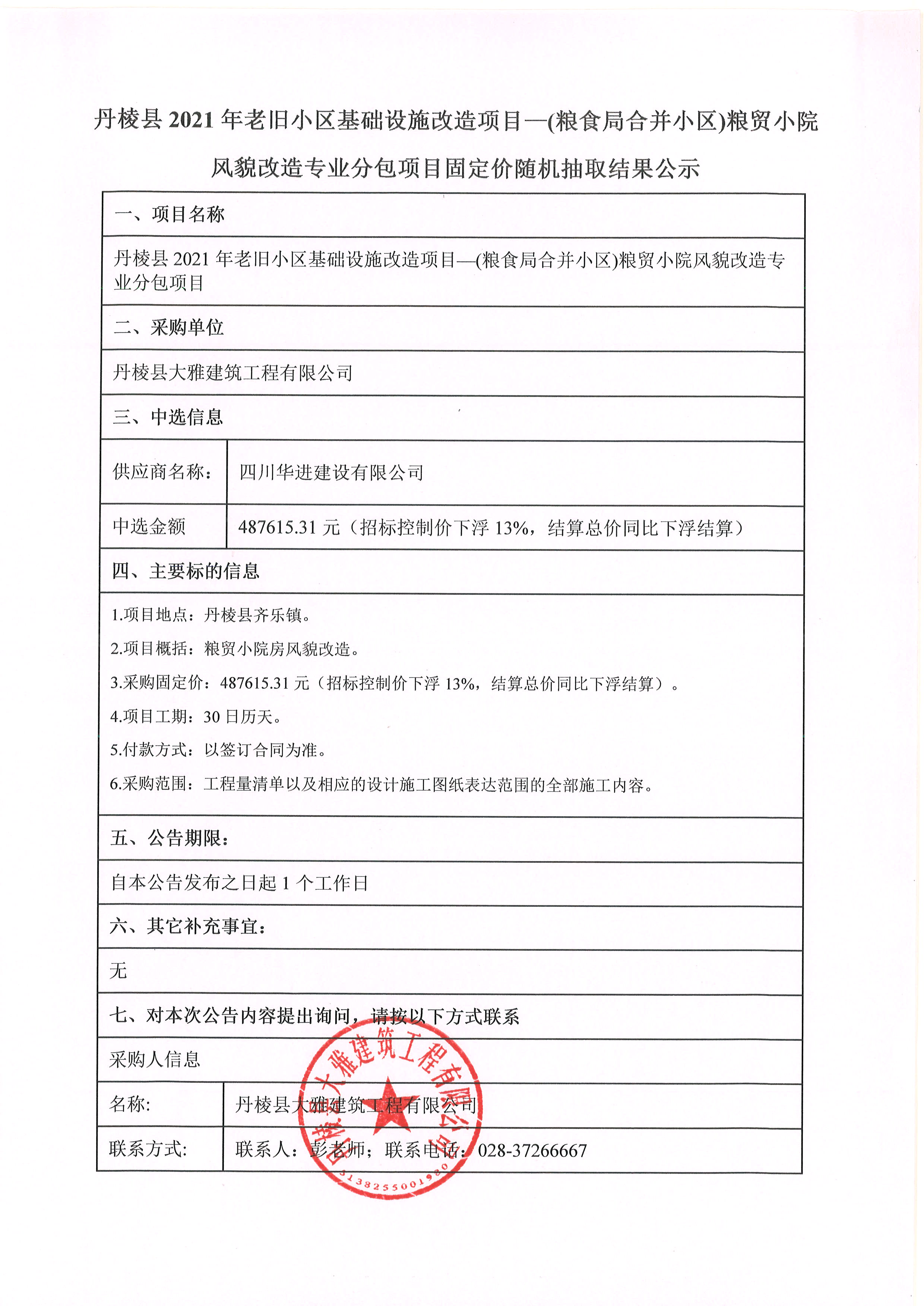 丹棱縣2021年老舊小區(qū)基礎設施改造項目一(糧食局合并小區(qū))糧貿(mào)小院 風貌改造專業(yè)分包項目固定價隨機抽取結果公示