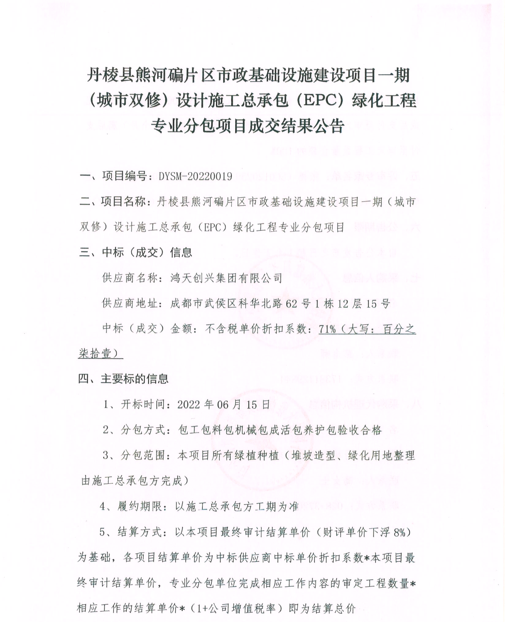 丹棱縣熊河碥片區(qū)市政基礎(chǔ)設(shè)施建設(shè)項(xiàng)目一期(城市雙修)設(shè)計(jì)施工總承包(EPC)綠化工程 專業(yè)分包項(xiàng)目成交結(jié)果公告