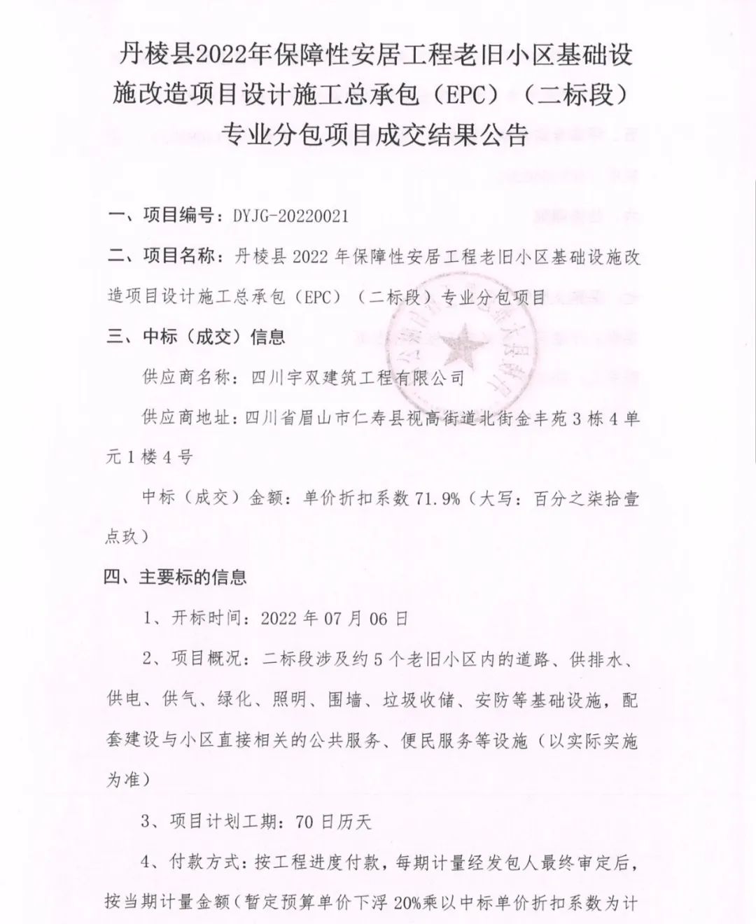 丹棱縣2022年保障性安居工程老舊小區(qū)基礎(chǔ)設(shè)施改造項目設(shè)計施工總承包(EPC)(二標(biāo)段)專業(yè)分包項目成交結(jié)果公告