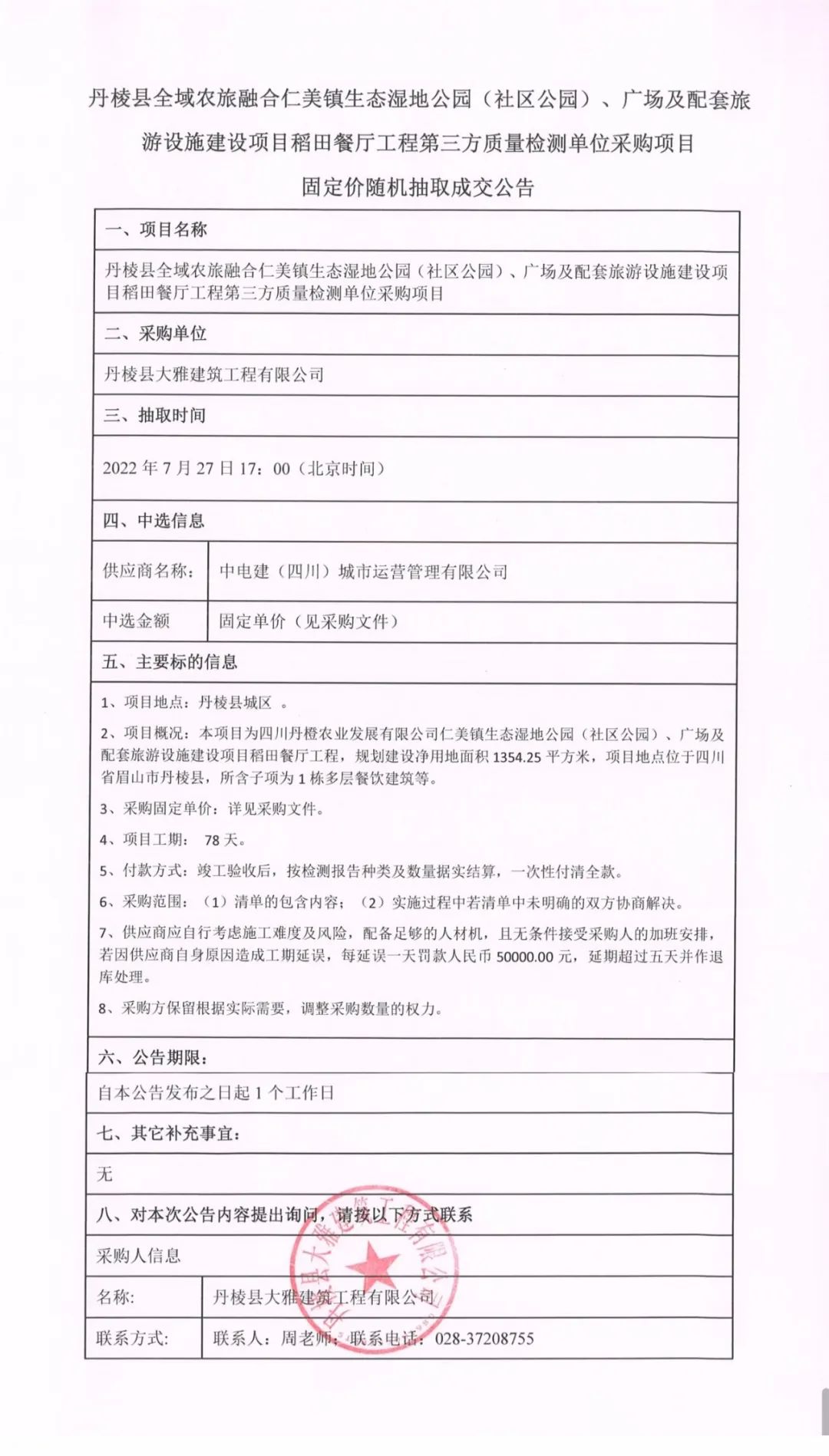 仁美鎮(zhèn)生態(tài)濕地公園(社區(qū)公園)、廣場(chǎng)及配套旅游設(shè)施建設(shè)項(xiàng)目稻田餐廳工程第三方質(zhì)量檢測(cè)單位采購(gòu)項(xiàng)目固定價(jià)隨機(jī)抽取成交公告