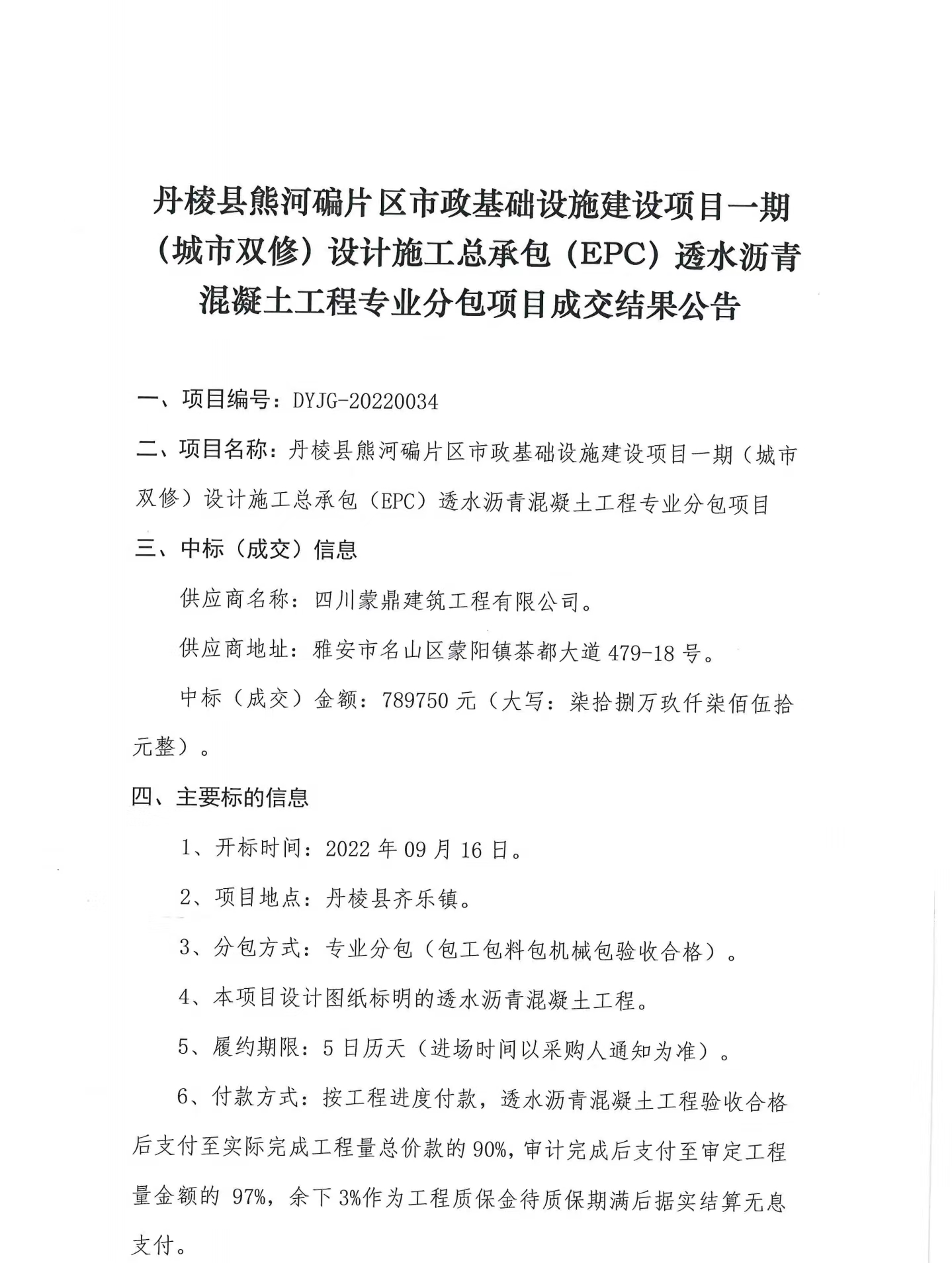 丹棱縣熊河碥片區(qū)市政基礎(chǔ)設(shè)施建設(shè)項目一期(城市雙修)設(shè)計施工總承包(EPC)透水瀝青混凝土工程專業(yè)分包項目成交結(jié)果公告