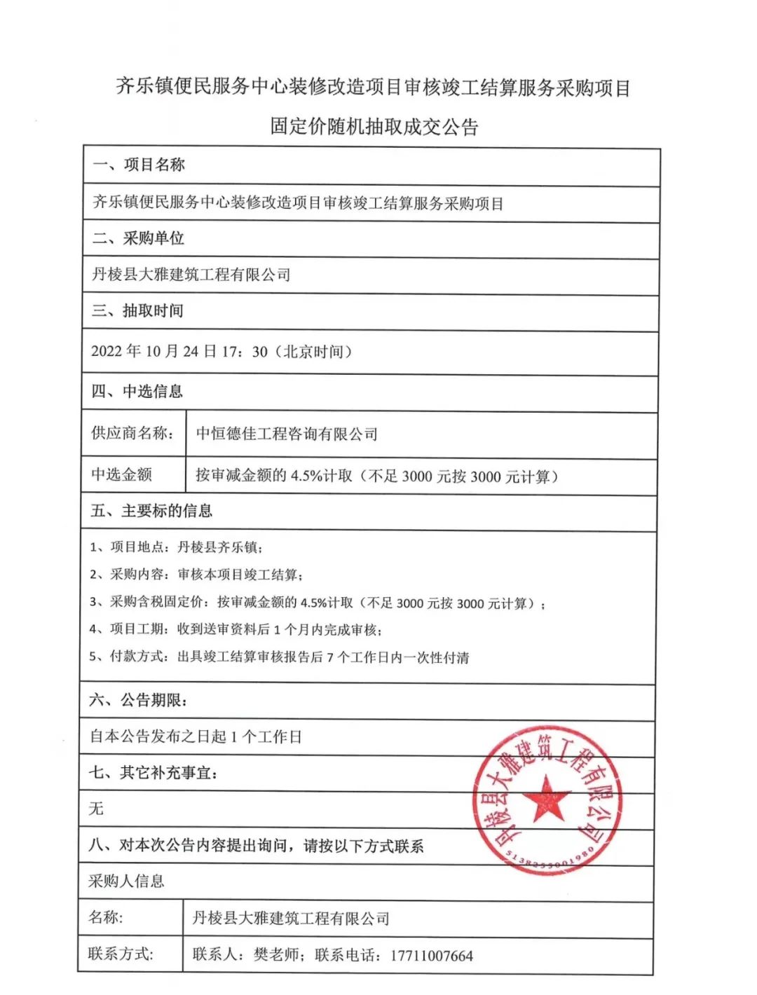 齊樂鎮(zhèn)便民服務(wù)中心裝修改造項(xiàng)目審核竣工結(jié)算服務(wù)采購項(xiàng)目固定價(jià)隨機(jī)抽取成交公告