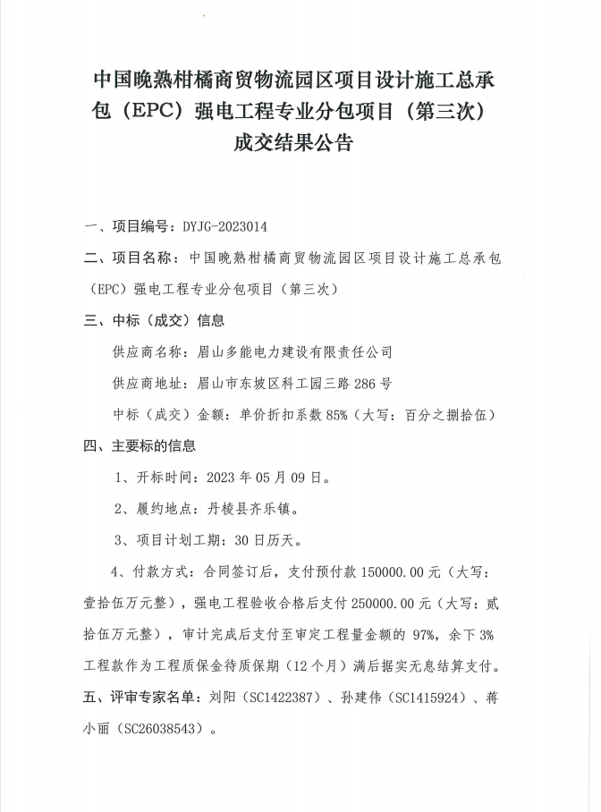 中國晚熟柑橘商貿(mào)物流園區(qū)項目設計施工總承包(EPC)強電工程專業(yè)分包項目(第三次)成交結(jié)果公告