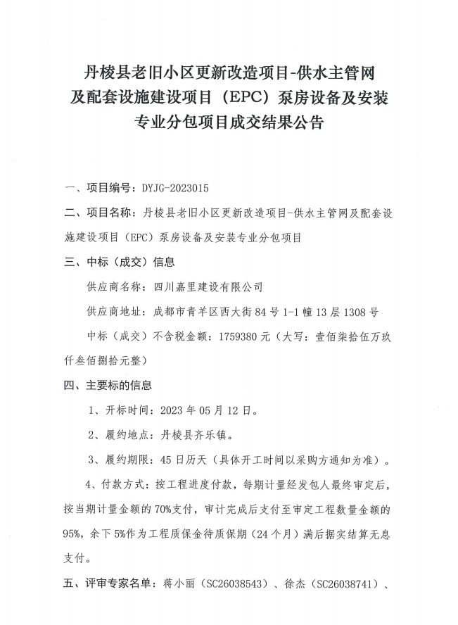 丹棱縣老舊小區(qū)更新改造項目-供水主管網(wǎng)及配套設施建設項目(EPC)泵房設備及安裝專業(yè)分包項目成交結(jié)果公告