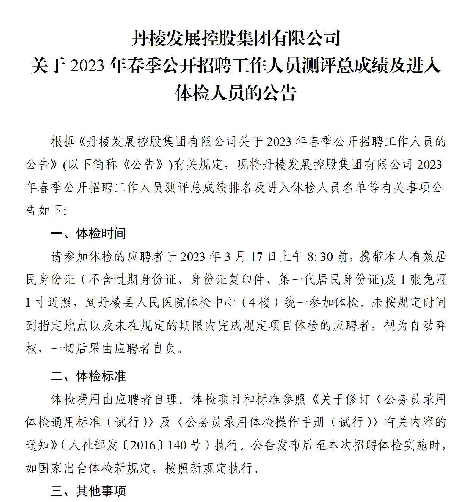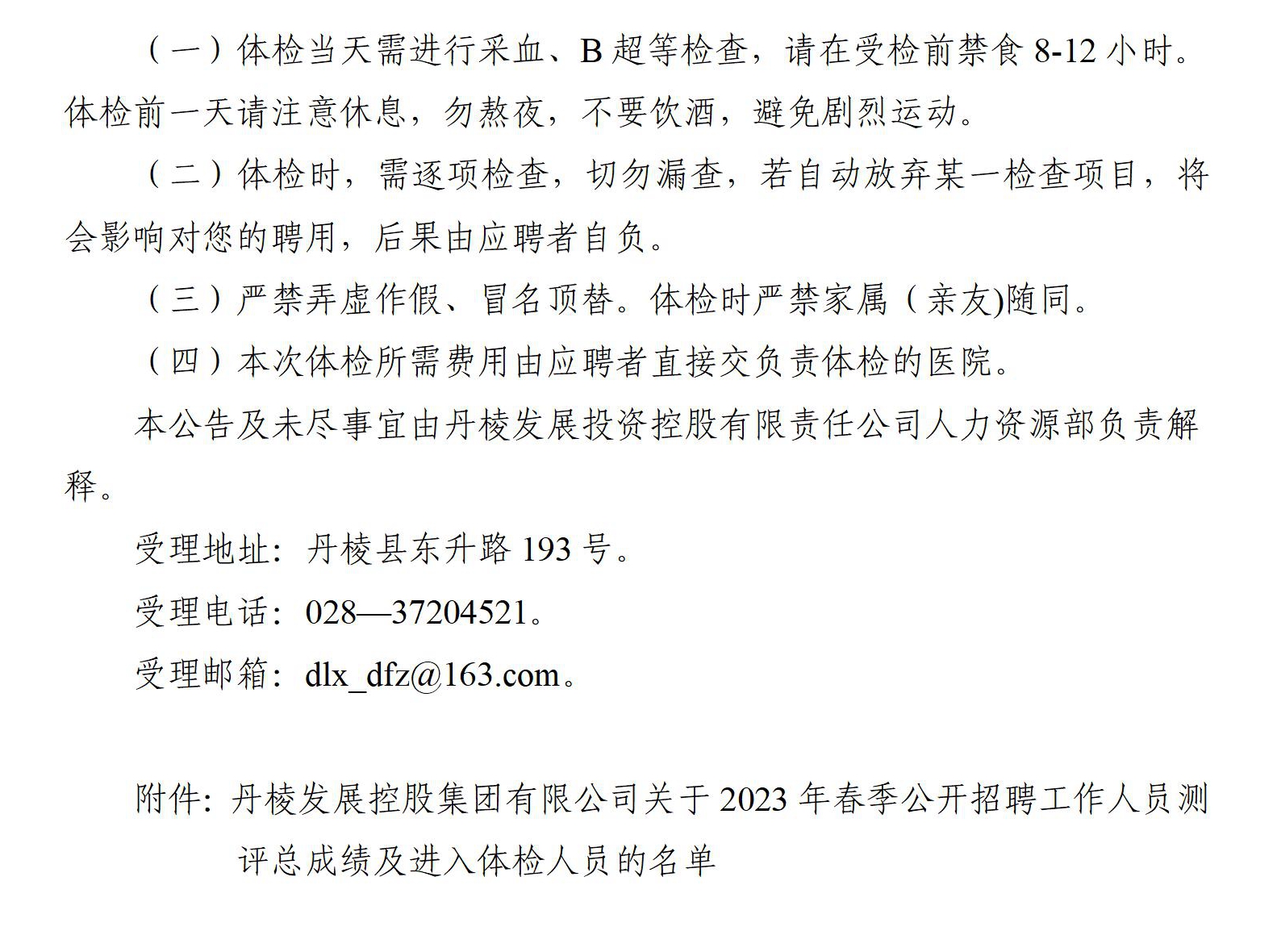 丹棱發(fā)展控股集團有限公司關于2023年春季公開招聘工作人員測評總成績及進入體檢人員的公告