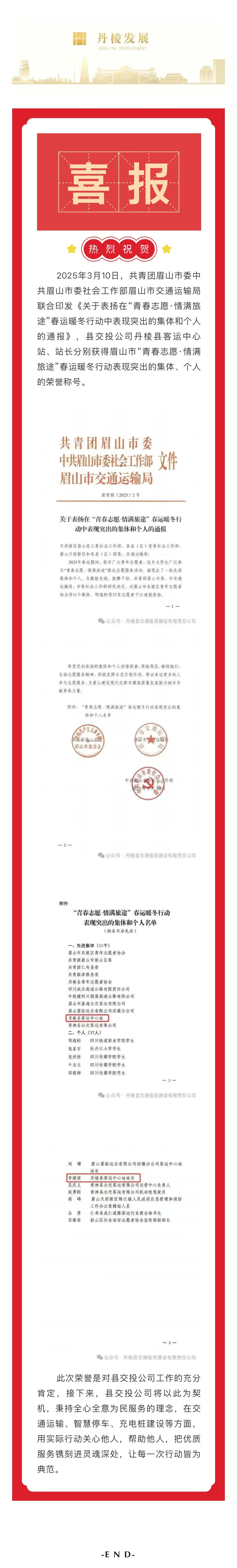 【縣交投公司】喜報(bào)!丹棱縣客運(yùn)中心站、站長(zhǎng)分別獲得眉山市“青春志愿·情滿旅途”春運(yùn)暖冬行動(dòng)表現(xiàn)突出的集體、個(gè)人榮譽(yù)稱號(hào)